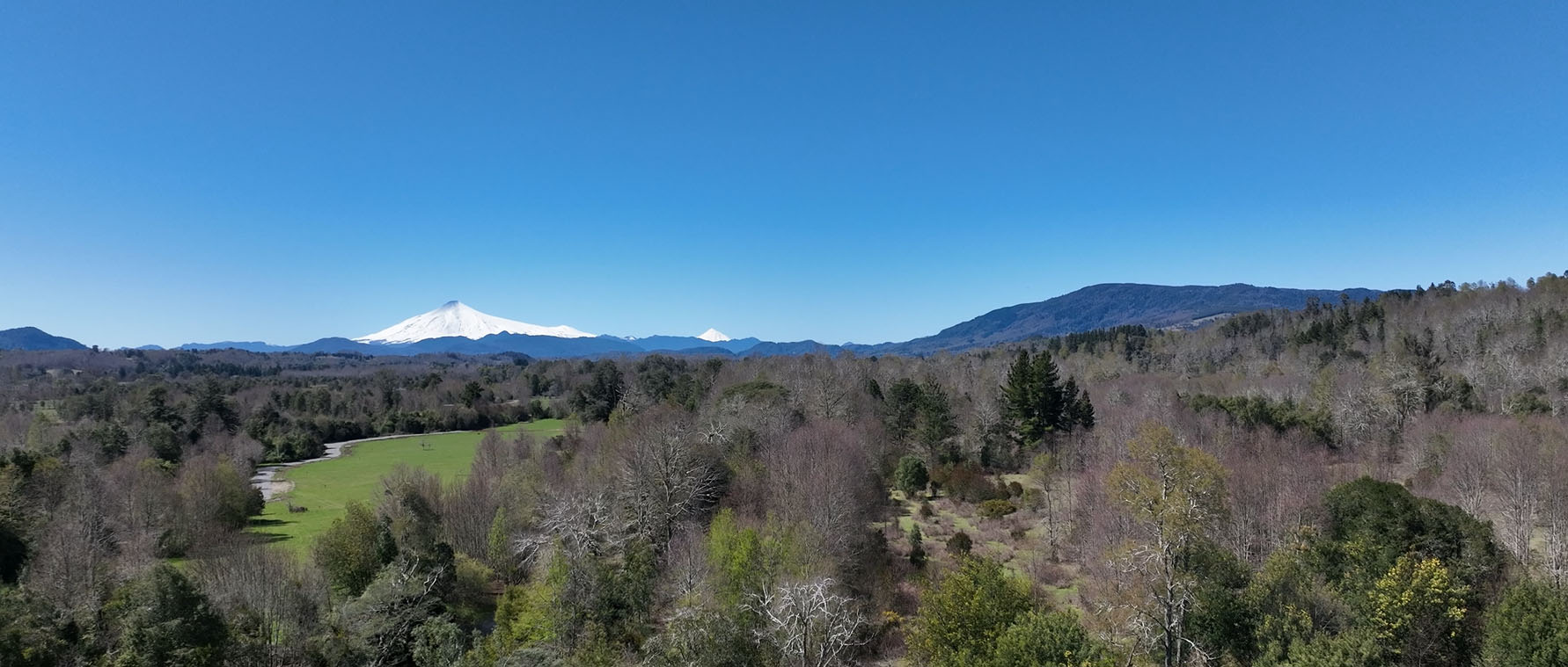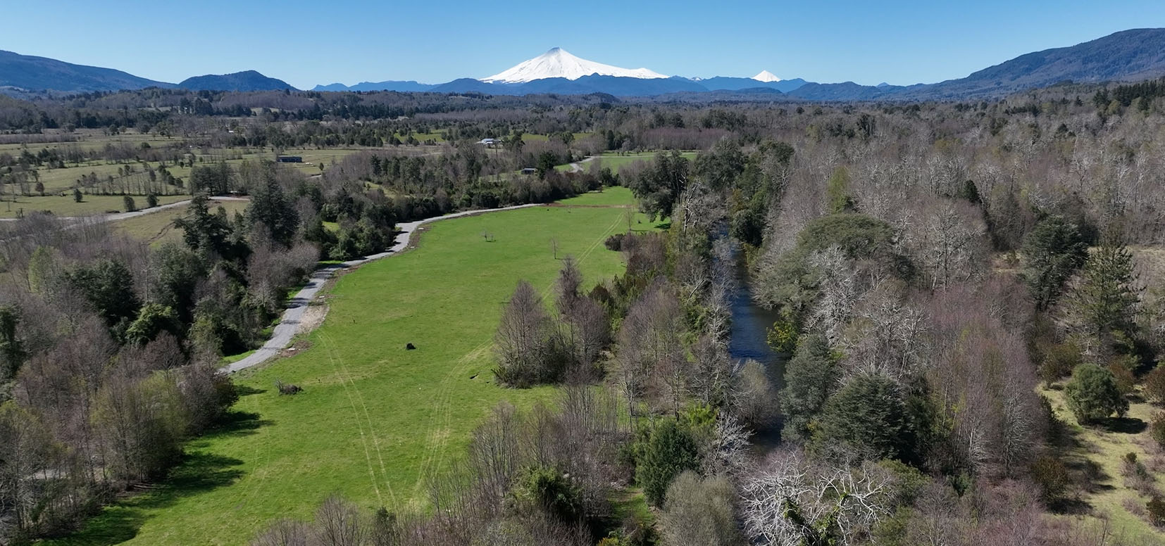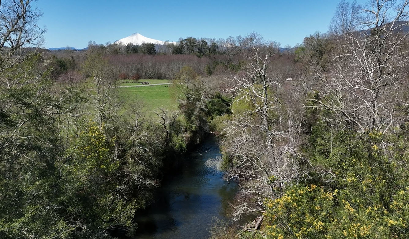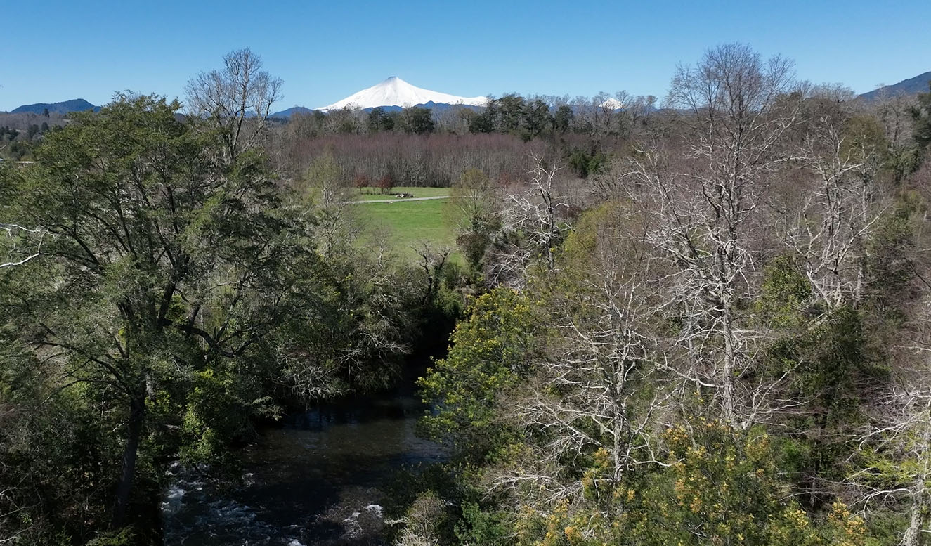 Bosque nativo, ríos de agua clara y vista al volcán Villarrica.