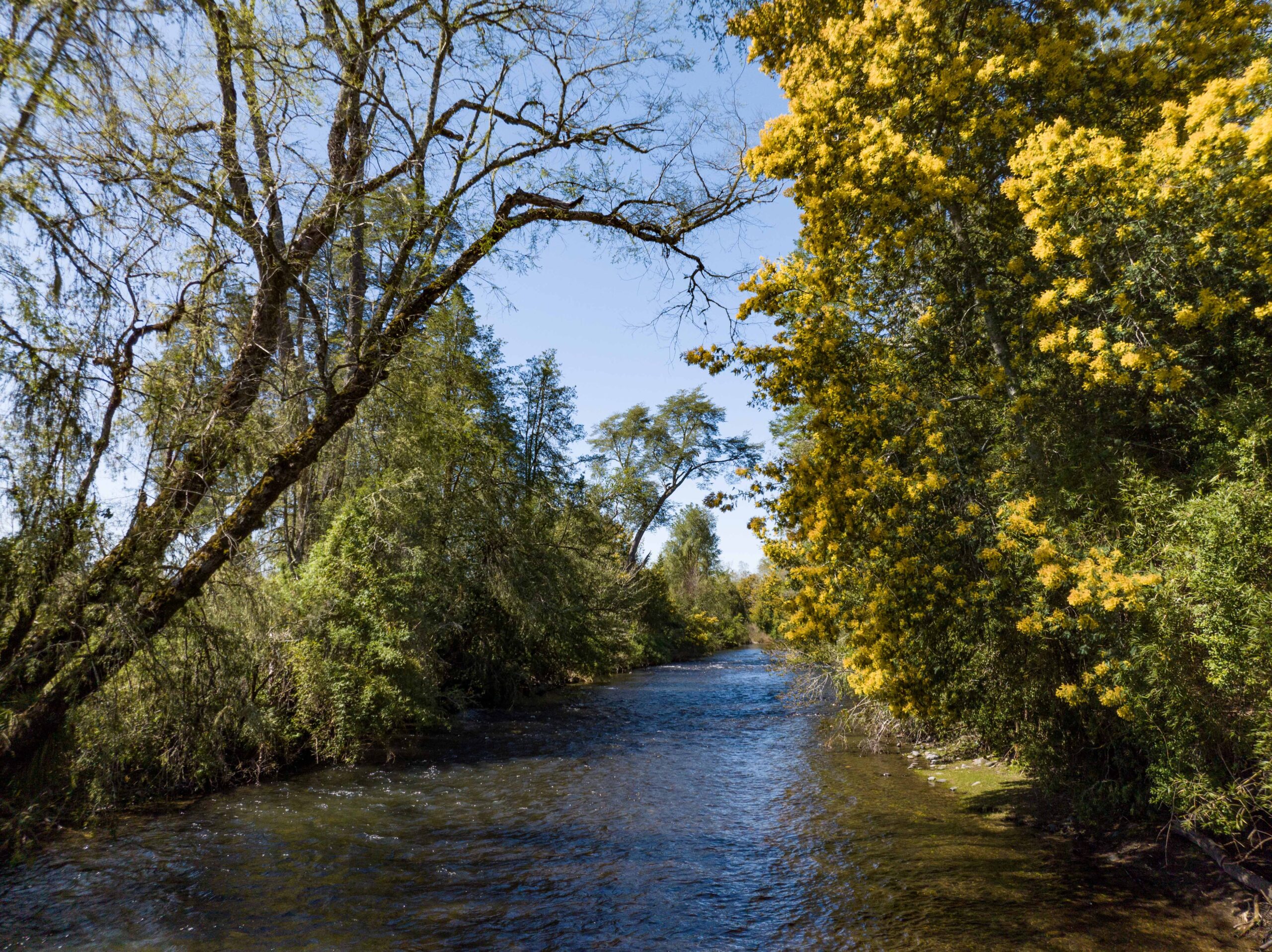 Un sendero de uso común recorre el borde del río, invitando a disfrutar de caminatas, pesca y baños en aguas puras del sur.